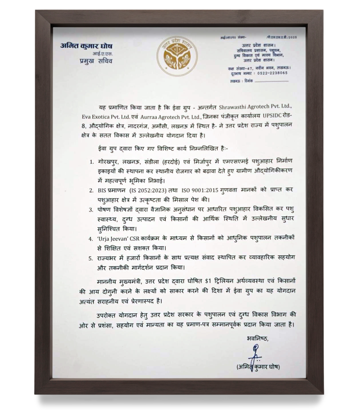 We are proud to share that in recognition of these meaningful contributions, the Principal Secretary, Shri Amit Kumar Ghosh (IAS), on behalf of the Department of Animal Husbandry and Dairy Development, Government of Uttar Pradesh, has awarded Eva Group with a Certificate of Recognition and Honor.