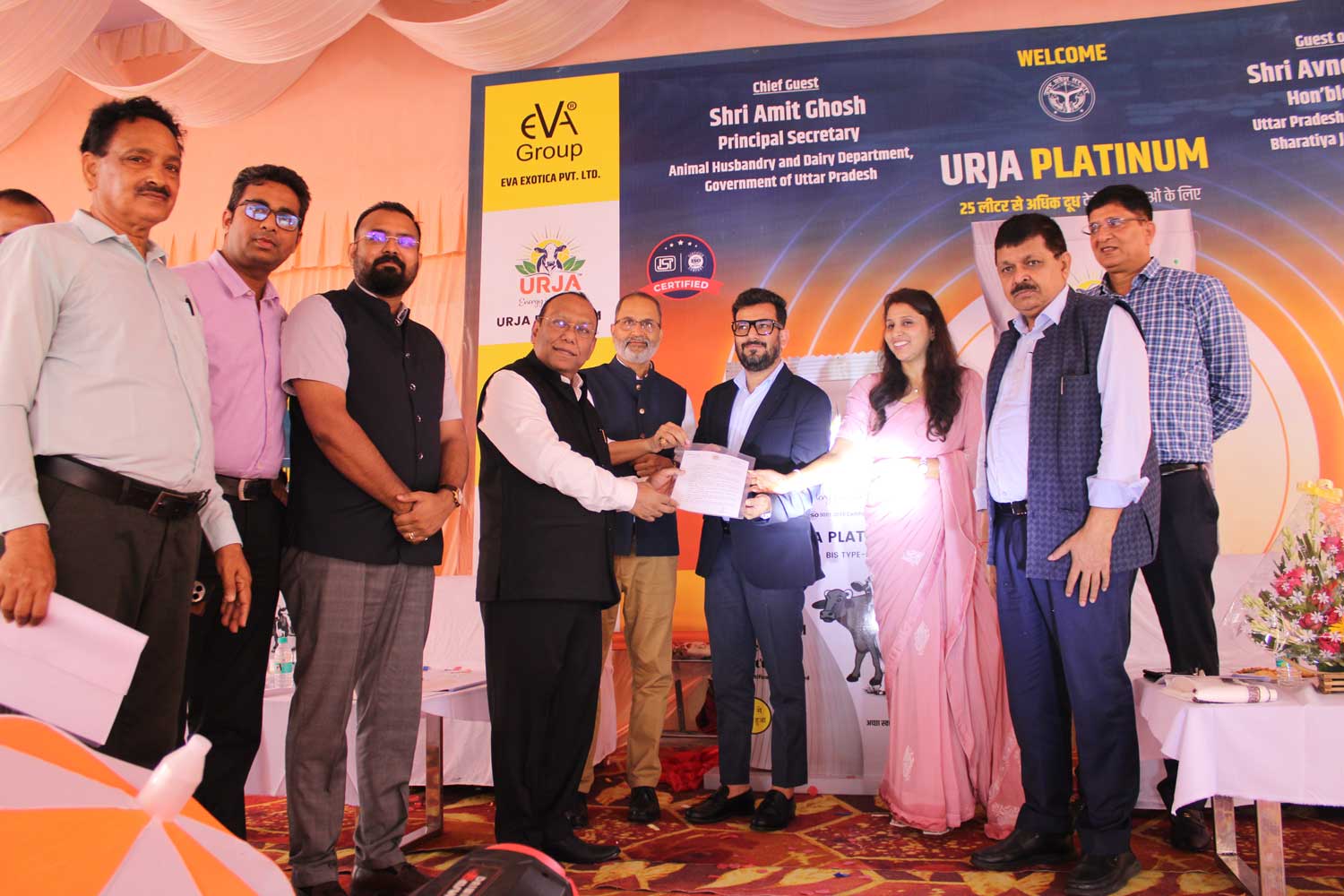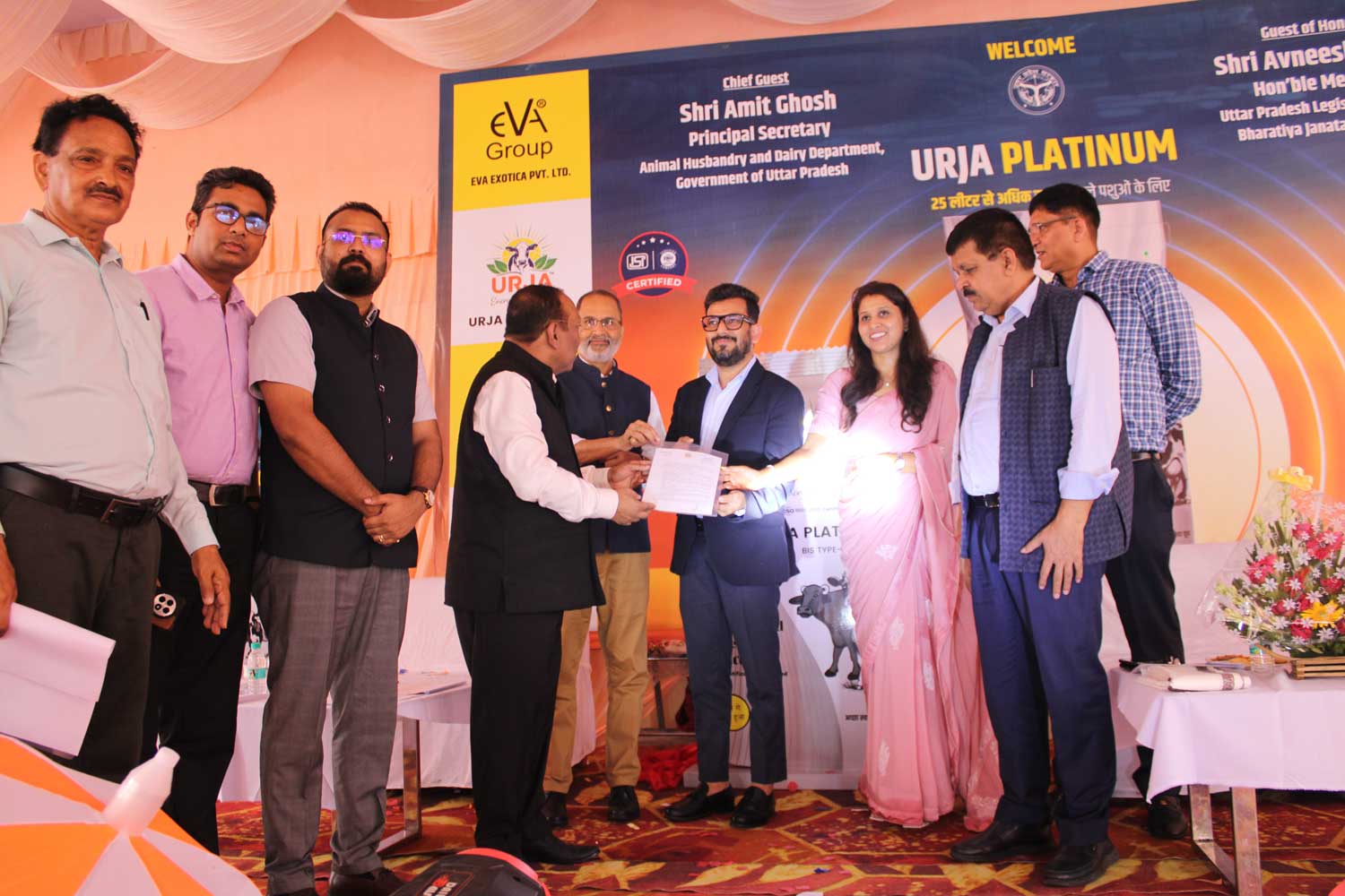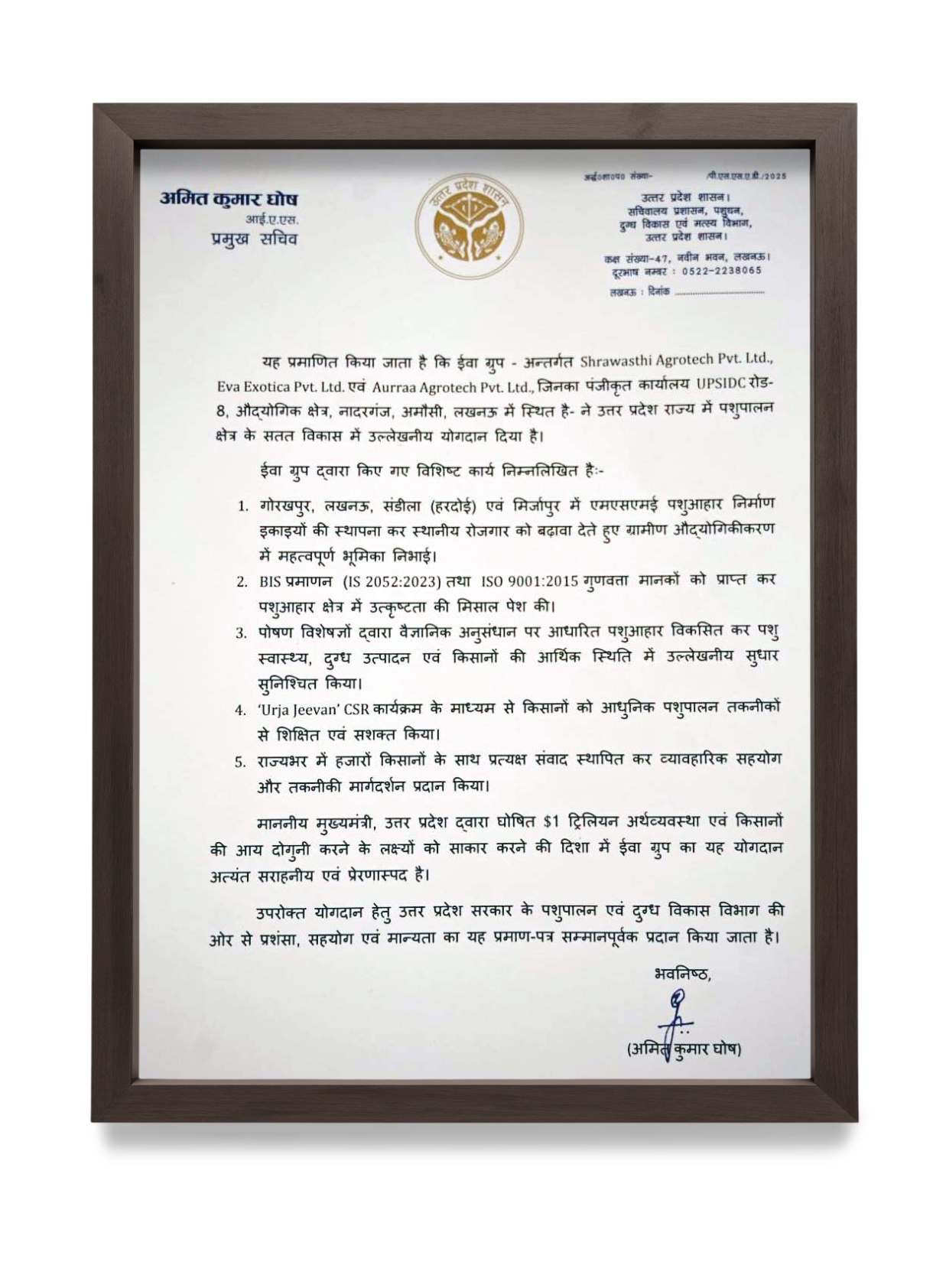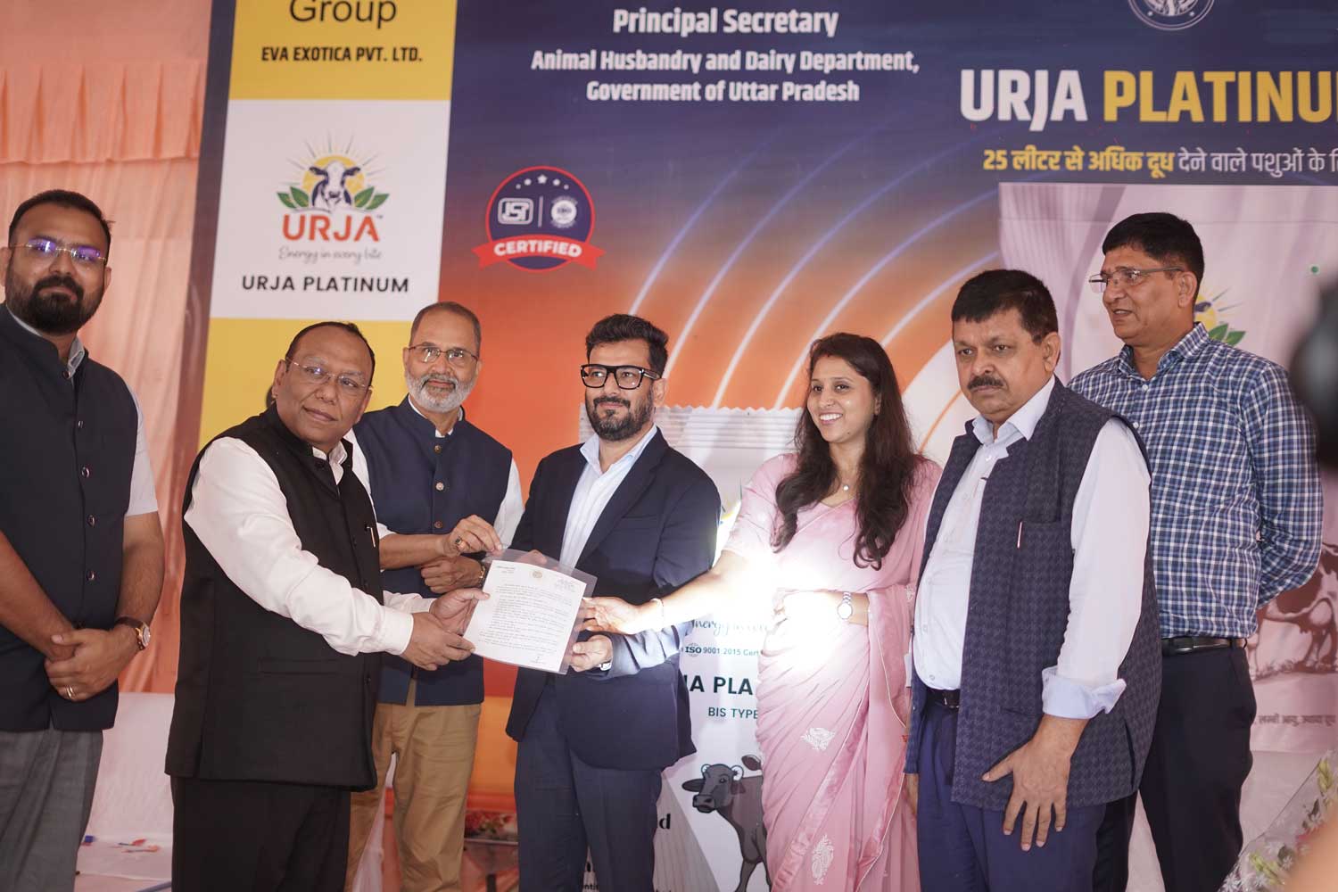 Urja Group, under Shrawasthi Agrotech Pvt. Ltd., Eva Exotica Pvt. Ltd., and Aurraa Agrotech Pvt. Ltd., has been proudly acknowledged by the Government of Uttar Pradesh – Department of Animal Husbandry & Dairy Development – for its outstanding contribution to the advancement of the animal husbandry sector in the state. This recognition reflects our commitment to innovation, farmer welfare, and rural development.